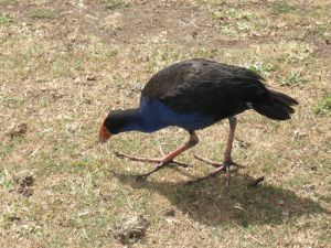 I started at the Taitua arboretum – a gorgeous wee place that I’d not seen or heard of before, and what a nice surprise it was. I’d definitely go there again. The place was full of birds, especially chickens. The arboretum is built around farm land, and there are two paddocks in the middle of it, so the arboretum and the farm are merged. Anyway, at several strategic points around the paths (and I spent an hour circling the place, because it was early and I had heaps of time and it was just too pretty to miss) there are chicken coops. The fat friendly chooks obviously expect human=food, and so I ended up trailing chickens, looking like a demented Pied Piper. Alas, the chooks were disappointed. There were also lots of pukeko: a native bird about the size of a chook, with truly enormous feet.