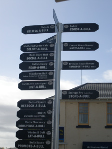 Bulls, where milk comes from in a very old joke round those parts, has reinvented its small farming town self as the home of puns. Everything has a bull painted on it and a pun – for example, the police station which is ConstaBull. Yes, I know, but I’m easily amused. Take a look at the town signpost.
